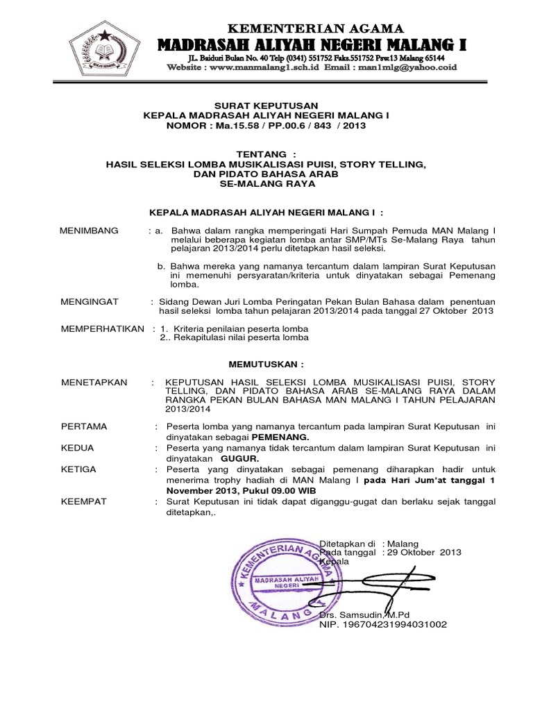 Surat Keputusan Ikatan Alumni Fakultas Teknologi Informasi from fti.unmerpas.ac.id Contoh surat keputusan pengangkatan karyawan tetap. Hukuman disiplin bagi pns untuk pembebasan dari jabatan, hukuman disiplin pegawai negeri sipil berdasarkan pp no. Pada postingan kali ini saya akan membagikan contoh surat keputusan penetapan juara pada lomba adzan, hafalan surat pendek dan baca puisi islam dalam acara peringatan maulid nabi muhammad. Bisa di download file word surat keputusan (sk) pengangkatan kepala madrasah diniyah contoh berikut adalah sebuah yayasan yang berada di desa cibenda, ciemas, sukabumi, jawa barat. Contoh surat pengangkatan jabatan karyawan swasta harus berisikan identitas dari karyawan yang diterangkan. Posted on august 5, 2012 by cahyafrance. Untuk mendapatkan file contoh surat keputusan pengangkatan karyawan kontrak yang tidak diproteksi dan bebas untuk diedit, silahkan anda kunjungi situs kami. Contoh surat keputusan pimpinan madrasah diniyah.
